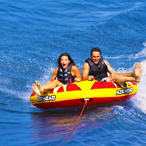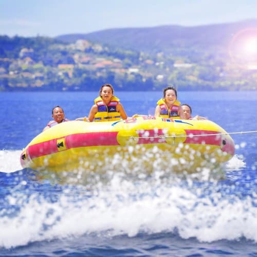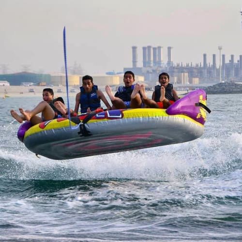 Donut Ride In DubaiDonut ride is a fun-filled activity which visitors can enjoy during their family vacation in Dubai. It is similar to a banana boat, although it stands out for its unique and brightly colored donut shape. Moreover, contrary to a banana boat, it offers a great sense of security with very less chance of falling out into the water. Regardless of adults or kids or young or old, almost anyone above 10 years can hop aboard this round inflatable boat, which will be drawn by a speedboat or a personal water craft along the beautiful shoreline of Dubai. Depending on your age and unique ride preferences, your donut boat will give you an exhilarating ride, twisting and rotating you in the middle of the sea. While it can seat up to two to four people at a time, it’s vital to make sure that the number of passengers on its either side are same. Contact us to know more about this incredibly exciting and enjoyable water activity.