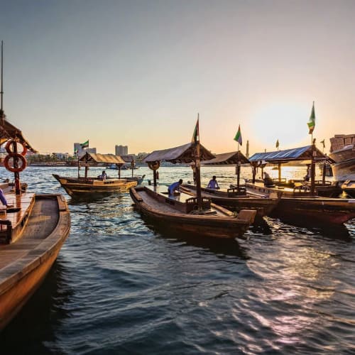 Continuing the journey, you'll pass by the famous Dubai Museum and reach the Abra Station. Step aboard a traditional wooden Abra boat and enjoy a delightful ride across the Dubai Creek. Afterward, enjoy some free time for lunch at the Al Ras Metro Station coach parking area, savoring the flavors of authentic cuisine.