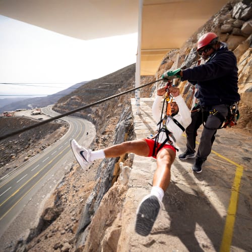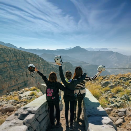 Embark on the Sky Tour and soar through the magnificent cliffs and canyons of Jebel Jais. This unique experience consists of a series of six ziplines, covering a total distance of 5 km. With zipline lengths ranging from 337 meters to just over 1 km, and speeds averaging 60 kph, you'll enjoy a thrilling and panoramic bird's-eye view of the towering Hajar mountains. As you navigate through the sky, you'll also have the opportunity to visit the UAE's highest sky bridge.