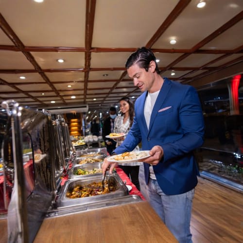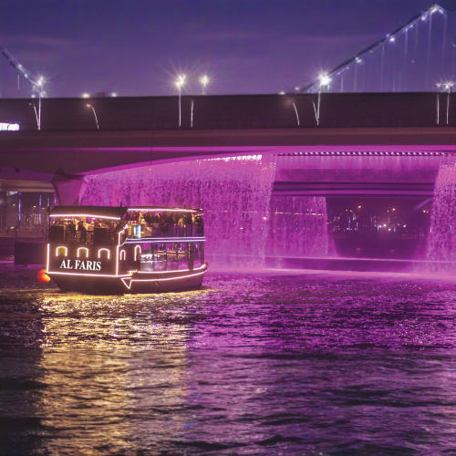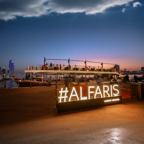 Unwind your evenings along the banks of the Dubai Water Canal, where the Al Faris Dhow offers the best of glass-enclosed and alfresco dining experiences. Relish a freshly prepared scrumptious buffet with stunning views of the Dubai skyline, swaying away to the soothing tunes played by our saxophonist as you soak up the city’s bustling atmosphere from a peaceful distance. Gently glide under the region’s first sensor operated waterfall bridge and prepare to be mesmerized as you have the option to disembark at Dubai’s No#1 Show-La Perle or simply return to Festival Bay, where you view the World's Largest Water Screen Projection - IMAGINE.